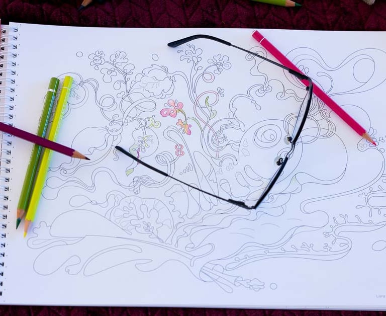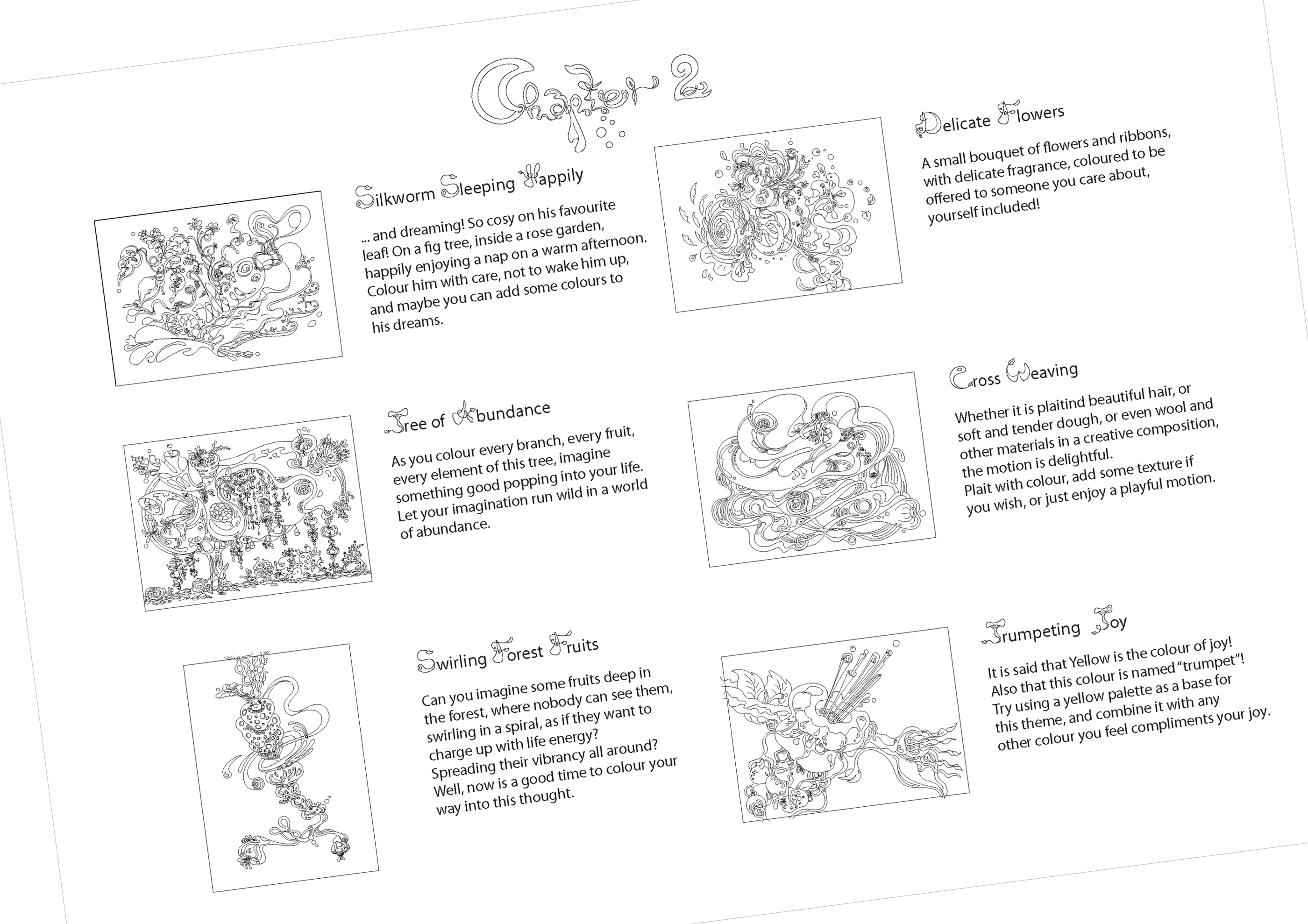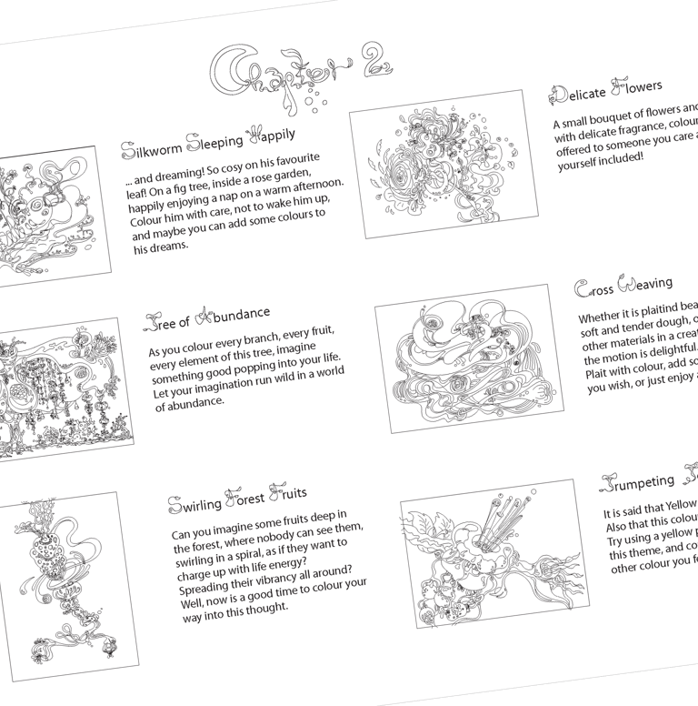 There are plenty of themes designed as workshops, where, as well as throughout the whole book, you are invited to add elements, lines, shapes, to mix colours, to stay within the lines, to colour outside the lines, or even in-between the lines!