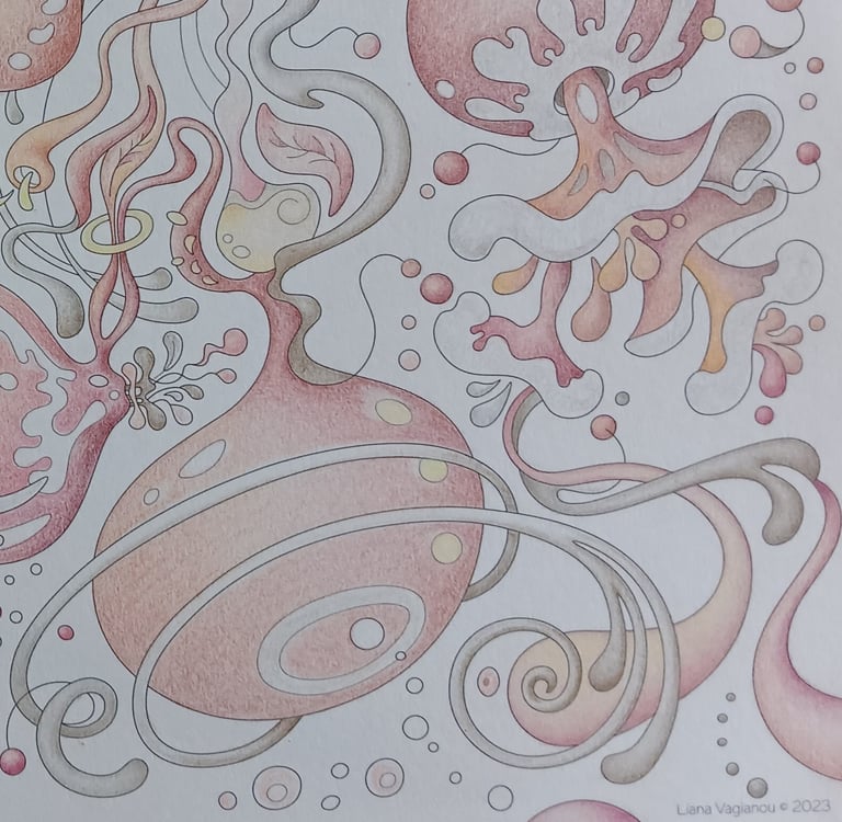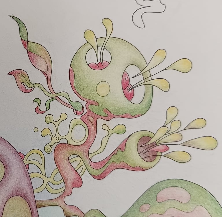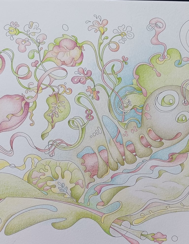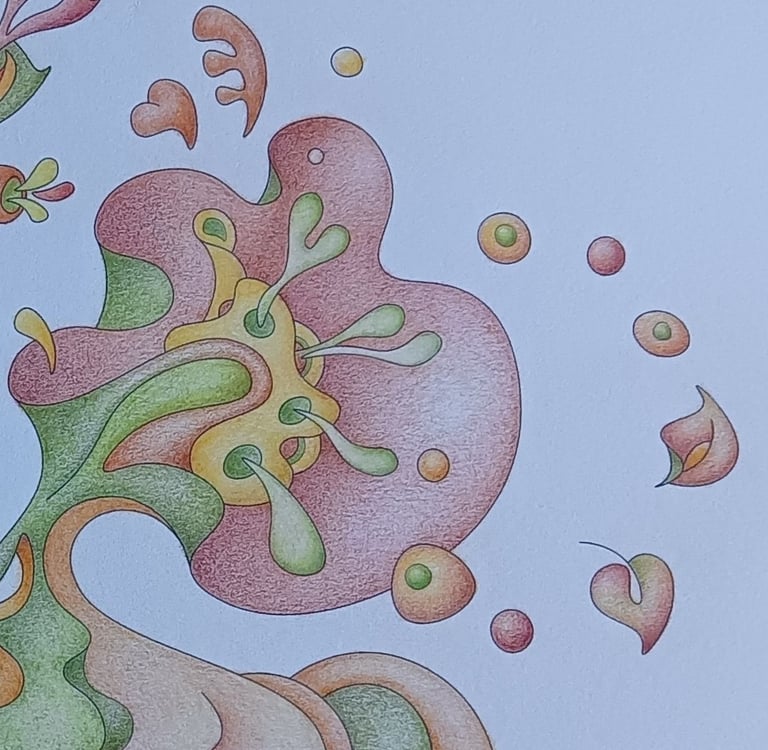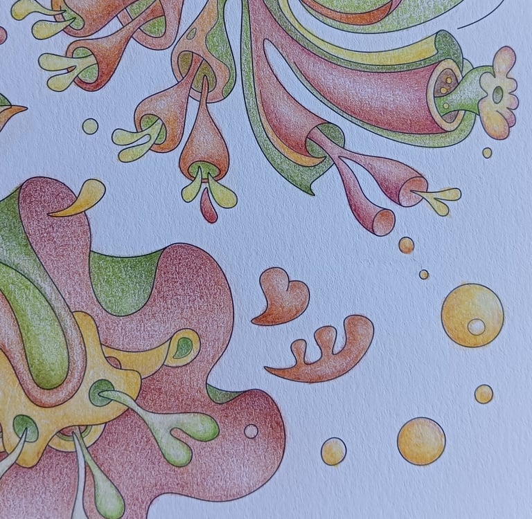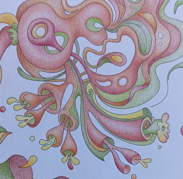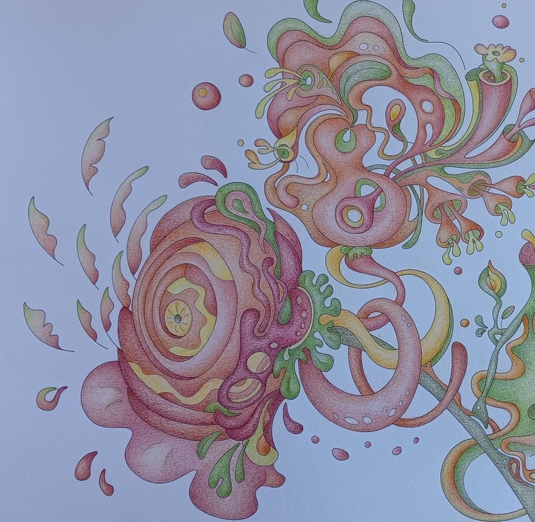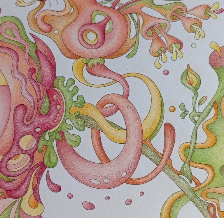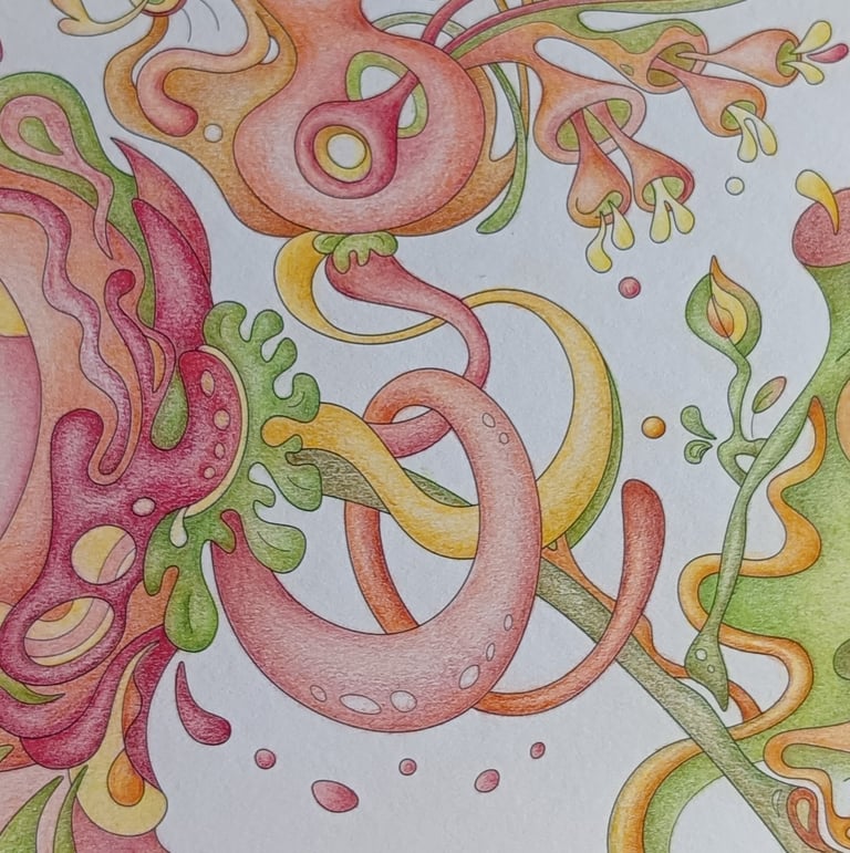 Let's begin our journey in this inspiration gallery, a space where the biophilic, surreal drawings of Intuitive Dialogues come to life, inviting you to explore them through coloured pencils and intuitive expression.