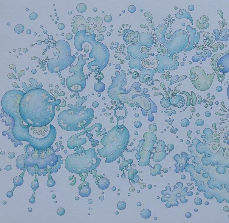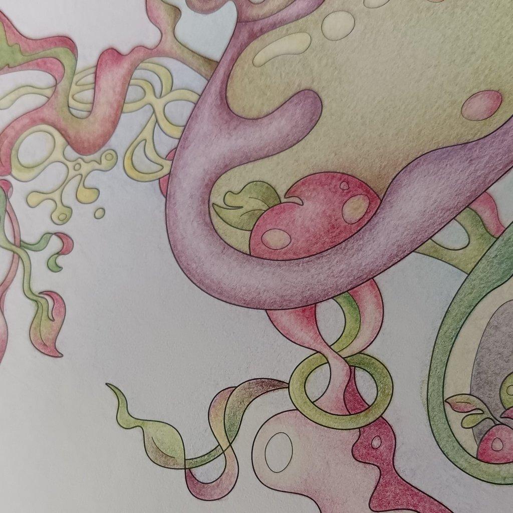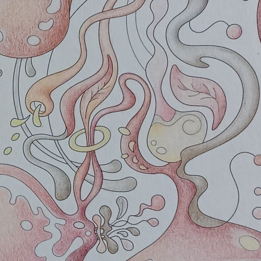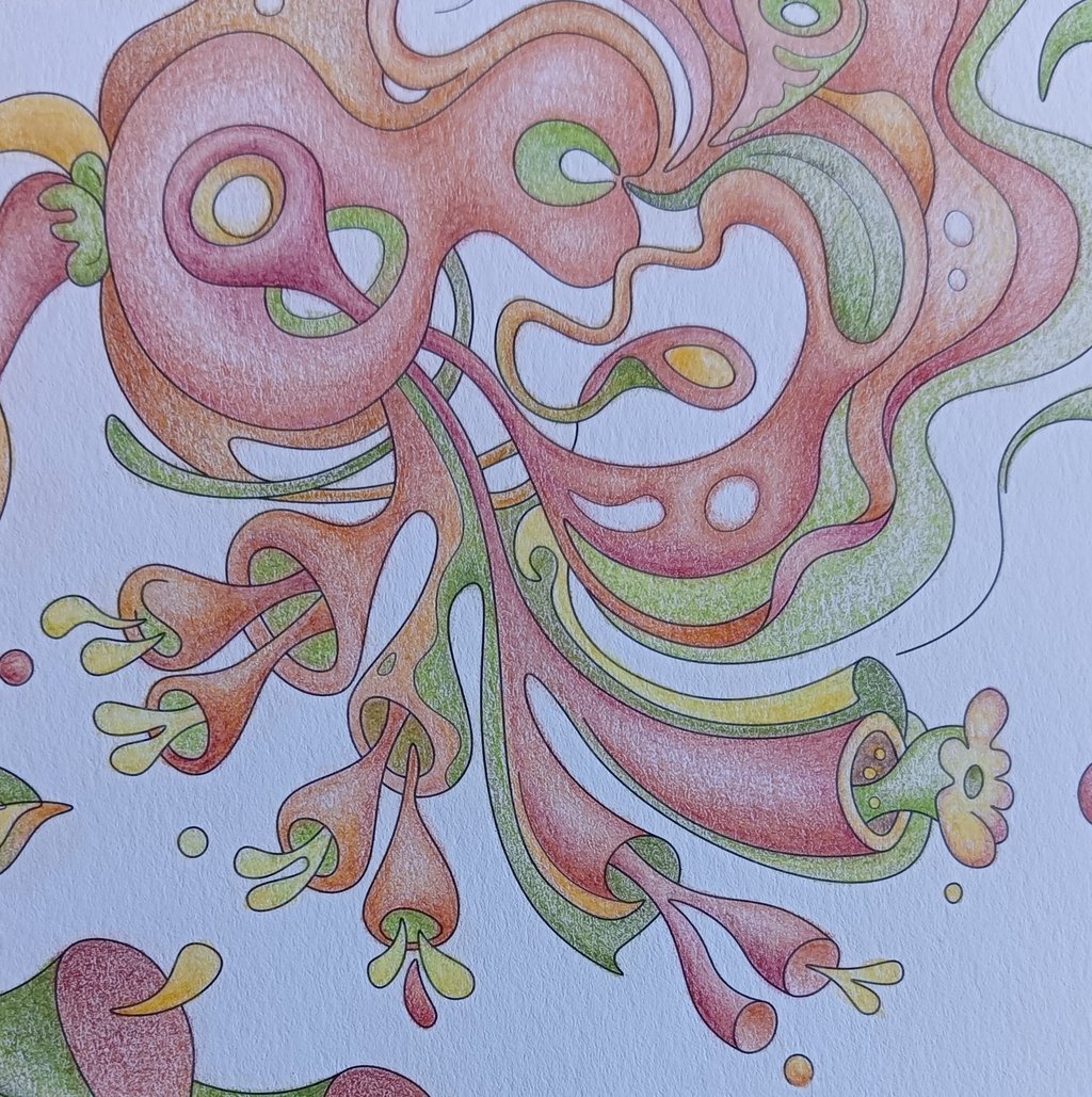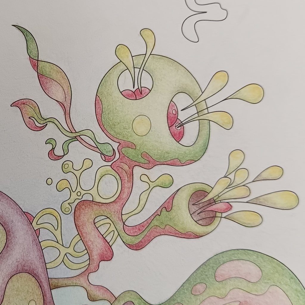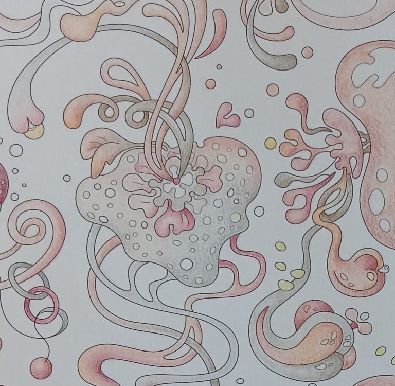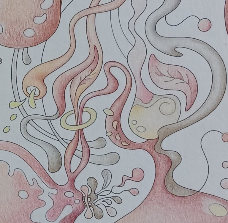 Let's begin our journey in this inspiration gallery, a space where the biophilic, surreal drawings of Intuitive Dialogues come to life, inviting you to explore them through coloured pencils and intuitive expression.