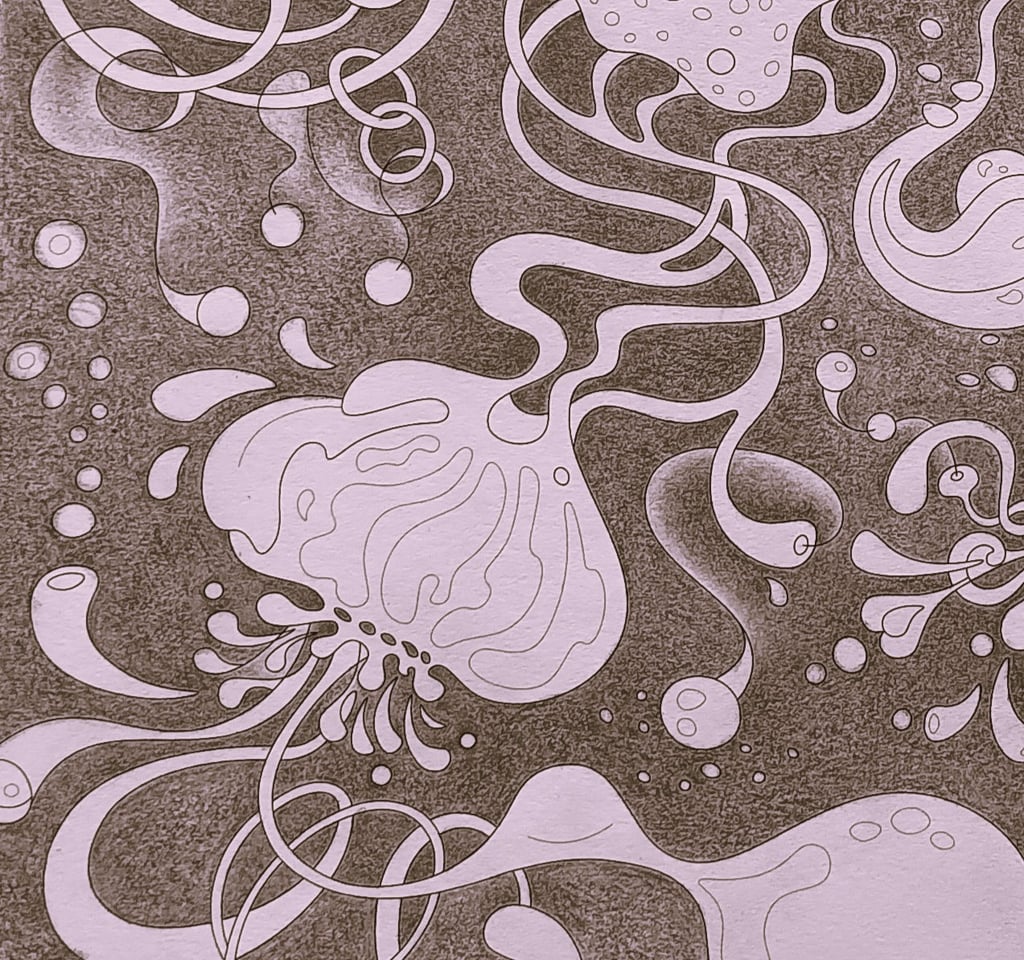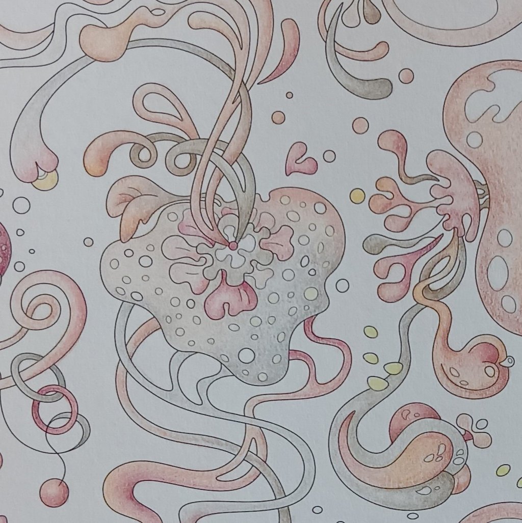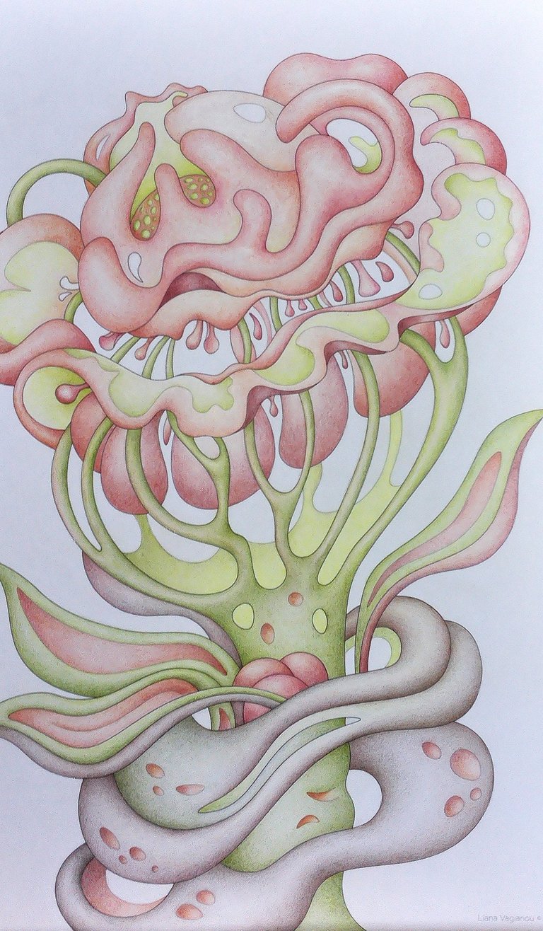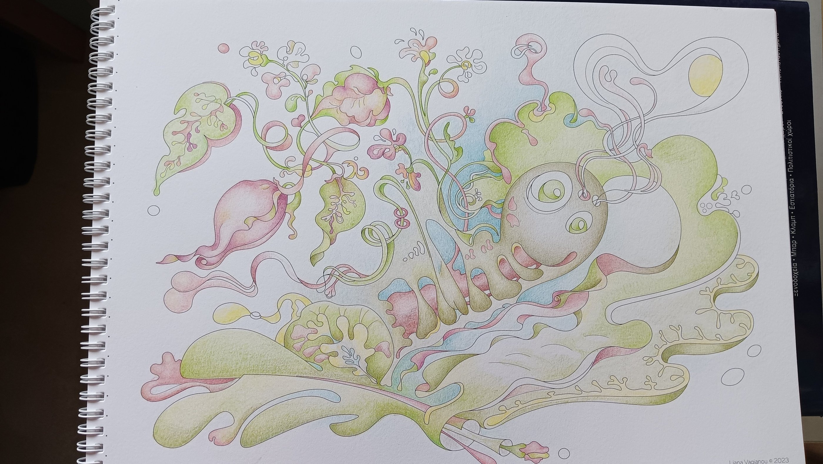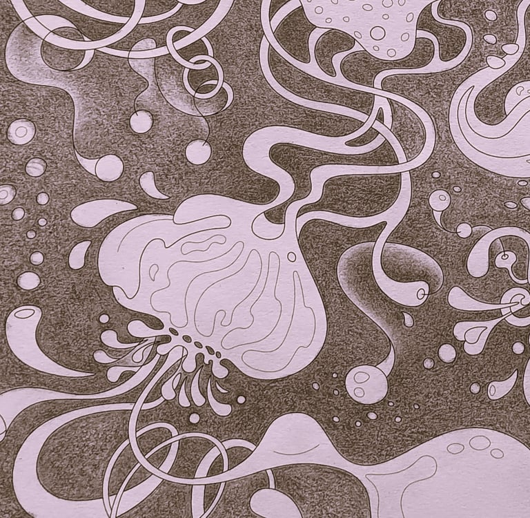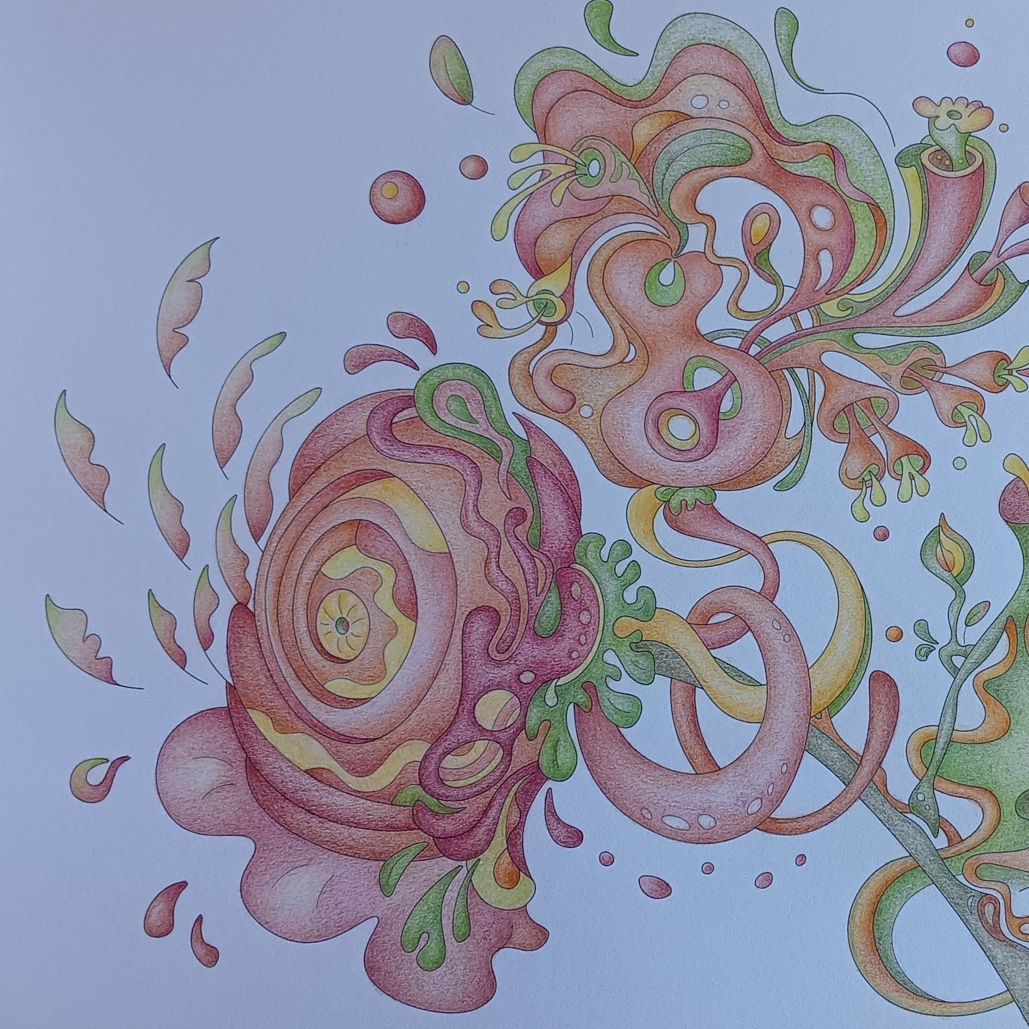 Let's begin our journey in this inspiration gallery, a space where the biophilic, surreal drawings of Intuitive Dialogues come to life, inviting you to explore them through coloured pencils and intuitive expression.